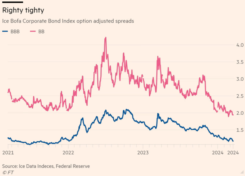 Possiamo vedere nel grafico di cui sopra che fa riferimento a società statunitensi che emettono obbligazioni di rating rispettivamente BBB (linea blu) e BB (linea rosa), un differenziale di rendimento rispetto ai Treasury americani storicamente basso, anche più basso dei minimi del 2021.